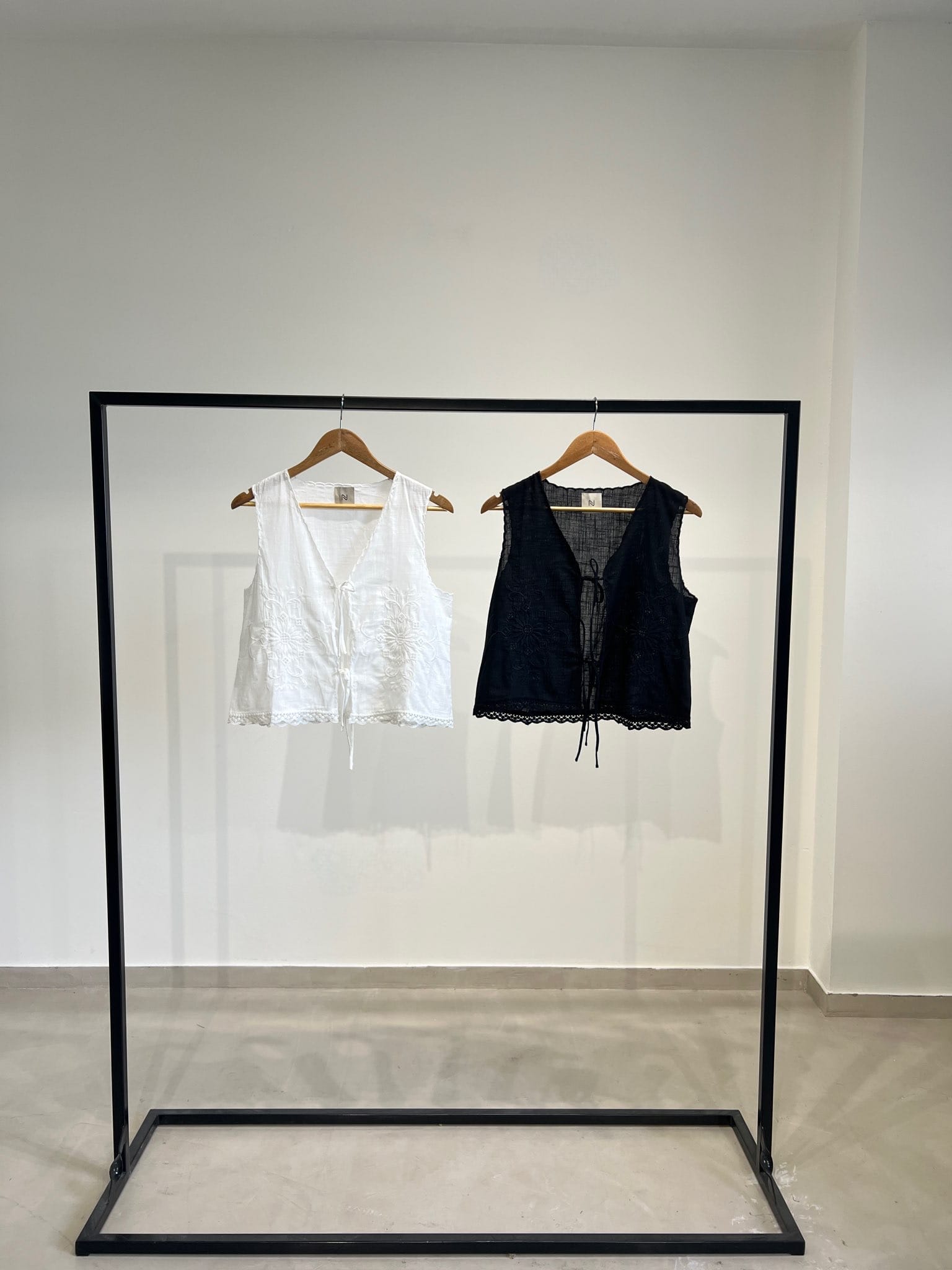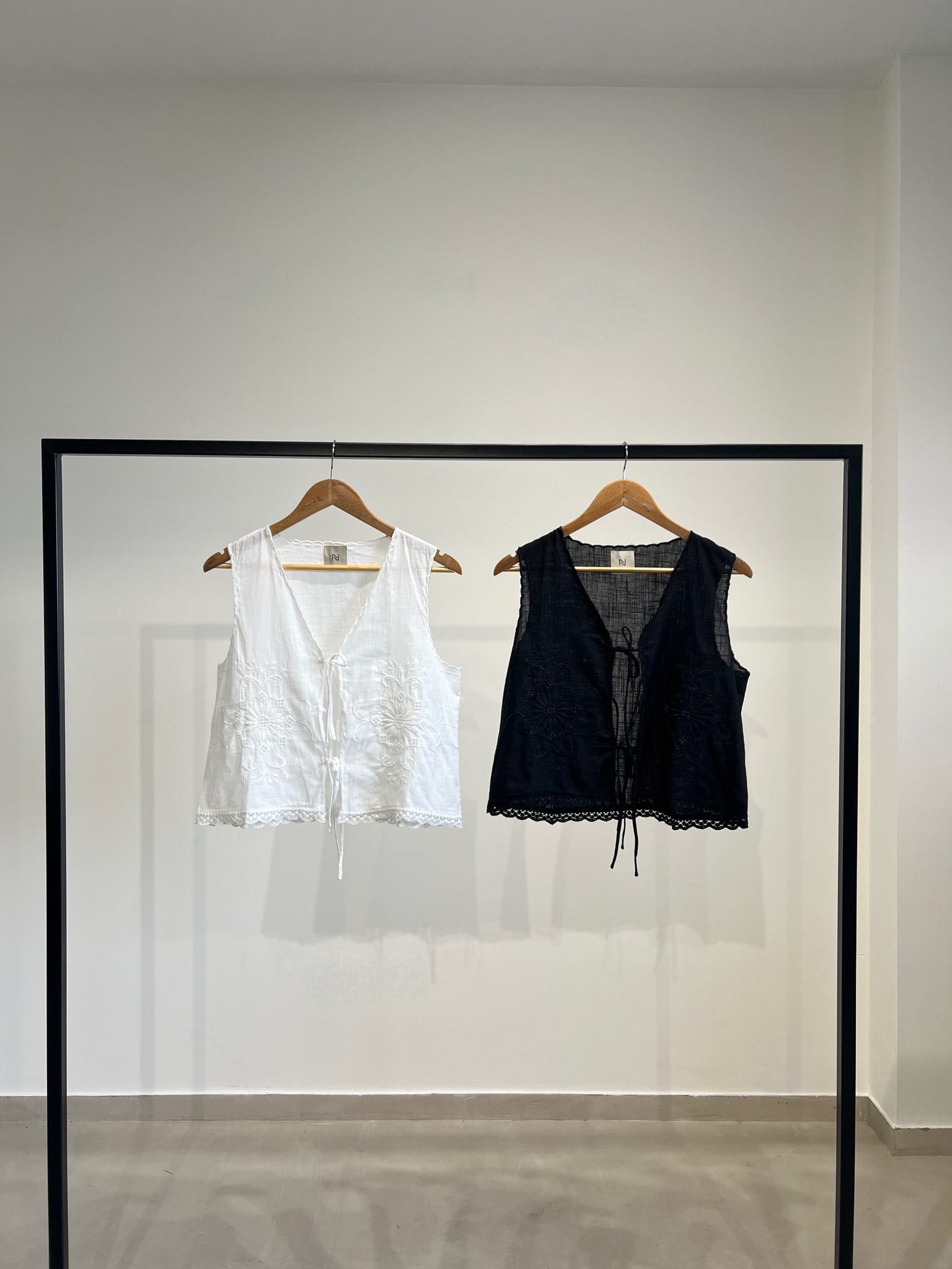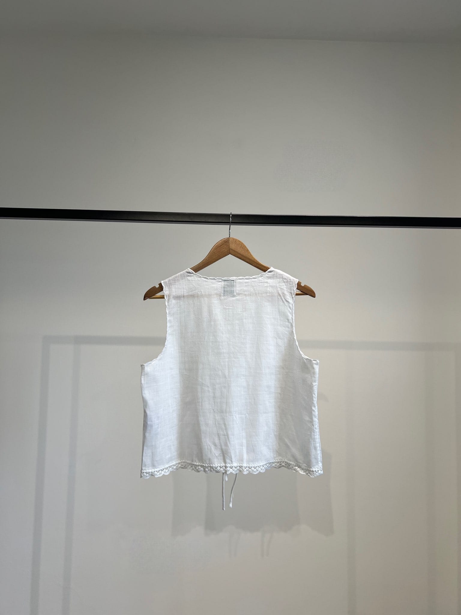 Musculosa con lazos para atar en el frente confeccionada en lino bordado